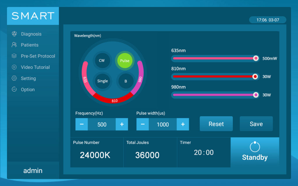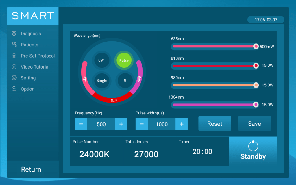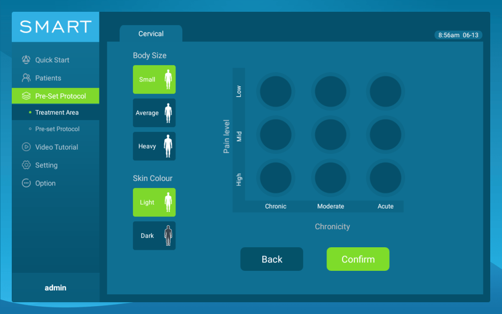 Select the patient’s skin color, body size, pain level and acuteness, you will get corresponding treatment preset parameters.